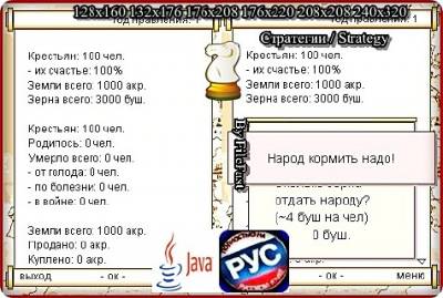 В этой java-игре, ты правишь кусочком земли, в Средневековой Европе. Твоя цель, защитить и накормить крестьян, засеять свои поля, отбивать нападения соседей на твои угодья. Жанр/Genre: Стратегии / Strategy Категория/Category: Java игры/Java games Размер экрана/Screen size: 128x160 132x176 176x208 176x220 208x208 240x320 Разработчик/Developer: Ga2me Платформа/Platform: Java Формат файла/File format: .jar Вид устройства/Appearance of the device: для телефонов/for phones Язык интерфейса/Interface language: русский (RU) Размер/Size: 1,50 Mb Статус игры/The status of the game: бесплатная/free Подготовил/Prepared by: FileFast